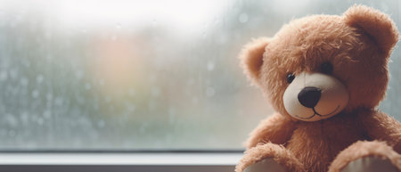 Teddy bear sitting on the window sill with rain drops on the background