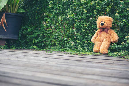 Smiling Teddy bear best friends toy for kids. Adorable Fluffy Brown Teddy Bear happy in green park. Happy fun friend fluffy cute toy doll sitting at garden. Stuffed Toy for kids Family childhood