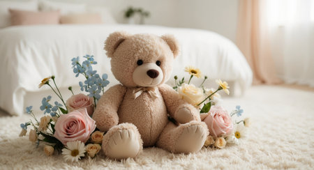 AI Generated. Charming Teddy Bear Sits Among Pastel Flowers in a Softly Lit Cozy Bedroom