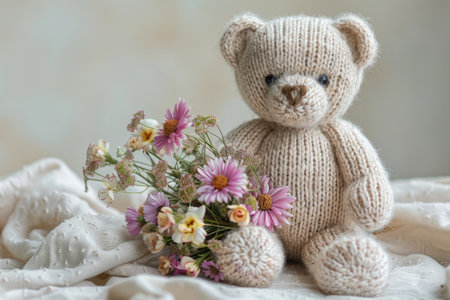 Knitted Teddy Bear with Wild Flowers and Lace Background in Soft Pastel Tones