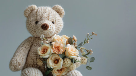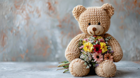 Adorable Knitted Teddy Bear Holding a Colorful Flower Bouquet on Artistic Background
