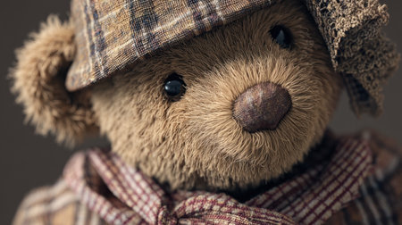 This charming teddy bear features a vintage cap and scarf, highlighting its soft fur and expressive face, perfect for capturing warm memories.