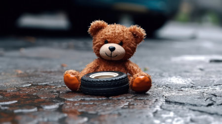 a small teddy bear with a car wheel on a wet slippery road after rain danger on the road.car accident. life and health insurance concept. Generative AI
