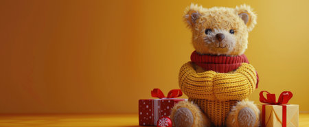 A teddy bear wearing a yellow knitted sweater holds a red gift box with a red ribbon. The bear is standing against a yellow background.