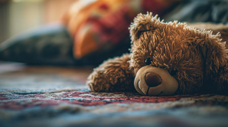 A plush teddy bear lies on its side on an ornate carpet, with a soft-focus background suggesting a cozy interior space.