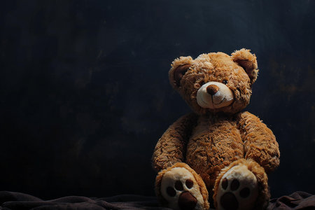 Brown teddy bear on dark background, vintage toned, copy space