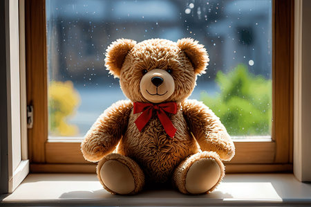 Teddy bear wating alone beside the window with warm sun flare as lonely or happy childhood concept.