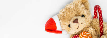 Banner with stuffed toy Teddy bear in a red Santa Claus hat on one ear, holding candy cane and two striped lollipops in its paws. White background, copy space. Concept of Christmas.