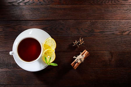 Cup of tea with lemon, mint and spoon on a wooden background. Top view