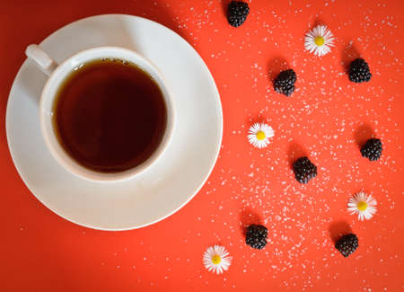 cup of tea with flowers. alstroemeria and a cup of tea. morning breakfast. beautiful still life. flatlay in light colors