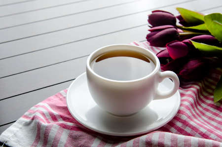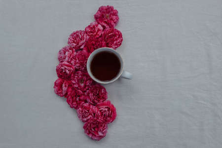 Mug with tea and pink flowers on a white background of fabric and tablecloth close-up, feat lay, with an empty space for text, copy space, romantic breakfast concept and decoration