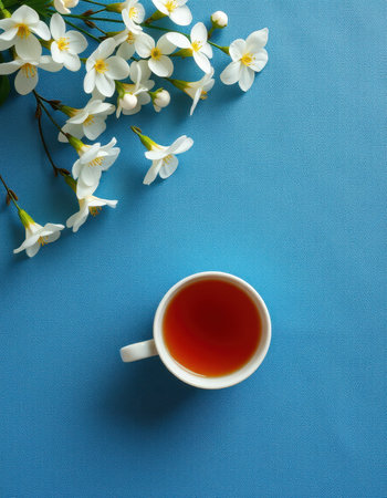 Refreshing herbal tea in a white cup beside blooming flowers on a vibrant blue surface