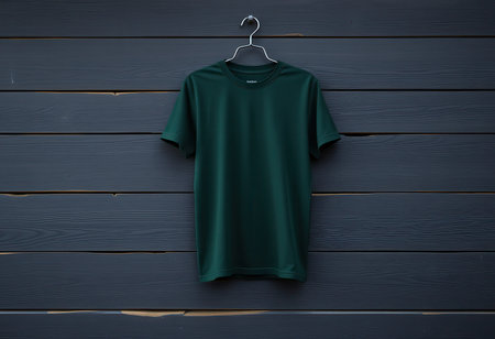 A green t-shirt hangs on a metal hanger against a black wooden wall.