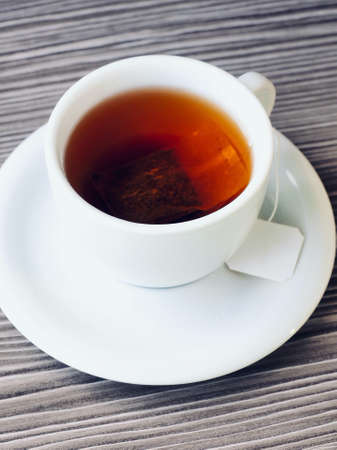 A cup of hot tea with a red tag on a knitted scarf on a wooden table
