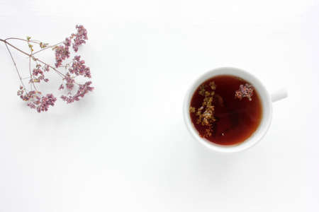 Cup of herbal oregano tea with dry marjoram flowers on white table background with copy space. Top view. Flat lay composition