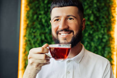 An attractive young bearded man, in a white T-shirt, sits in a cafe and drinks tea, a smiling guy holds a cup in his hand