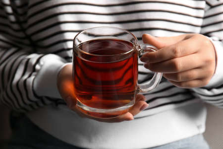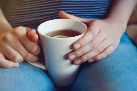 White glass of tea with lemon in the hands of a girl close-up. The concept of warmth, comfort and coziness. Blurred photo, soft focus.