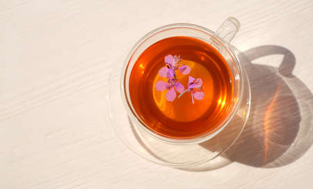 Tea cup with willow-herb on wooden background top view with sunlight and shadows