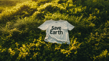 A white t-shirt with the text Save Earth prominently displayed rests on vibrant green grass. The warm sunlight enhances the tranquil atmosphere, promoting environmental awareness.