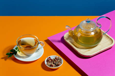 Hibiscus red tea in a white cup and saucer on pink and orange background divided on two parts. Selective focus. Top view
