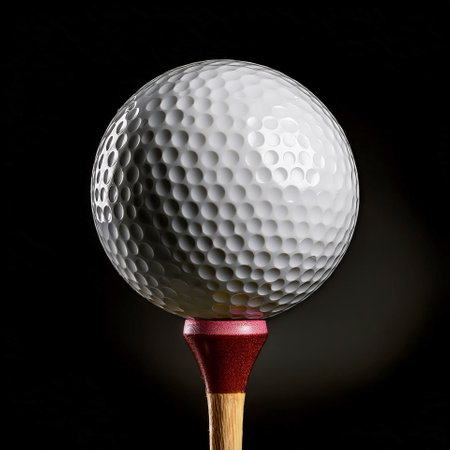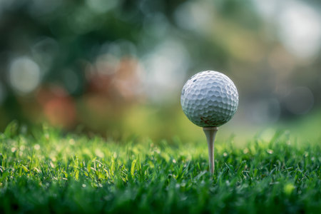 A detailed shot of a pristine golf ball resting atop a tee, set against vibrant, well-manicured grass under bright, sunny skies, evoking a sense of re