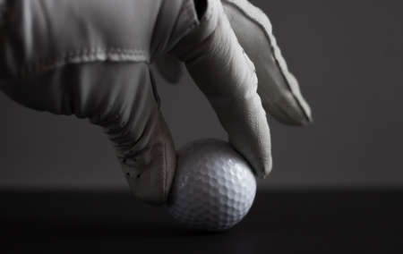 hand in a glove keeping a golf ball on black background closeup