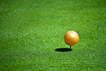 Golf ball on tee ready to be shot,The golf player On the green lawn background. Close up of white golf ball on yellow tee on grass.