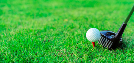 Golf ball on the green grass, banner. Sport golf ball on background with copy space.