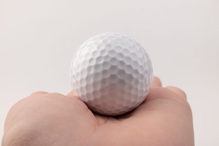 Close up hand holding golf ball on white background.