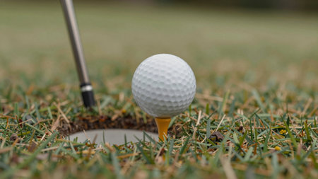 On a serene morning, a pristine white golf ball teeters on a tee, just inches from the hole. The lush green grass surrounds the scene, hinting at a promising day of play.