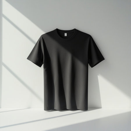 Blank black t-shirt lying flat on a textured concrete background. The shirt's plain design makes it suitable for mockups or promotional use. --chaos