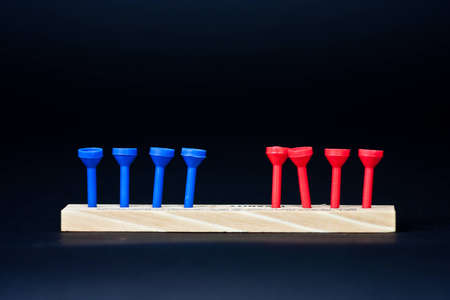 Blue and red golf tees on a black background in a line with some leaning