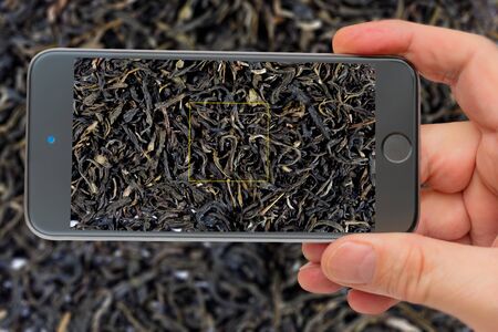 Black tea for making a refreshing drink. Textures of black tea. Black tea on the smartphone screen.