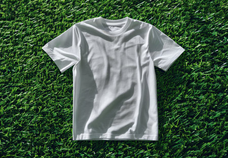 Cotton white tee template laid out on lush green grass, ai generated. Natural tshirt mockup advertising image. Clothing design short-sleeved. Apparel casual clothes mock up product photorealistic