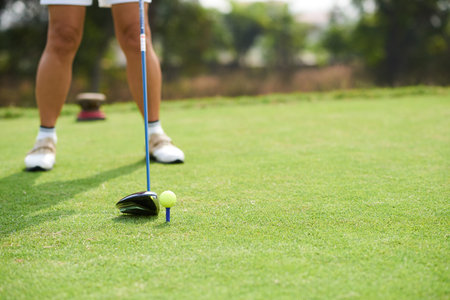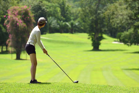 Hand asian woman putting golf ball on tee with club in golf course on sunny day for healthy sport. Lifestyle Concept