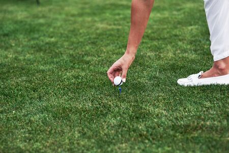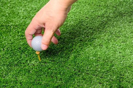 The man's hands are putting the golf ball on the tee. in the green lawn. To prepare for the start of golf game.