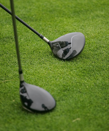 Close-up golf ball on tee with golf drivers at golf course, it could be used in a golf magazine or website. It could also be used in a brochure or advertisement for a golf course.