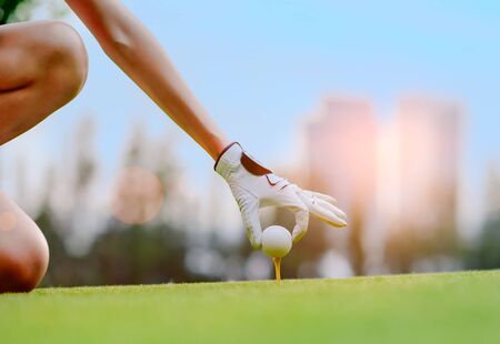 Hand asian sporty woman putting golf ball on tee with club in golf course on evening on time for healthy sport. Lifestyle and Sport Concept