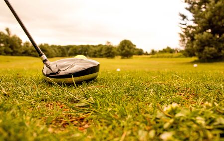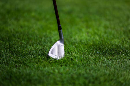Blurred golf club and golf ball in grass field. high quality photo