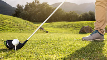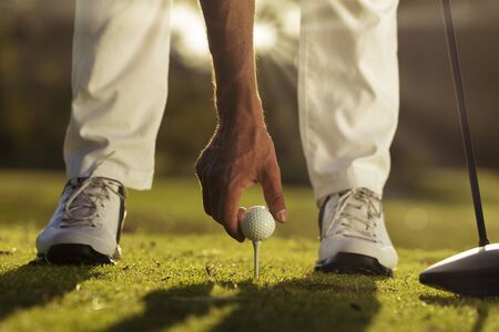 golf player placing ball on tee. beautiful sunrise on golf course landscape in background