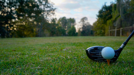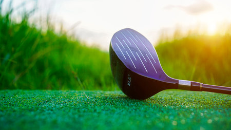 Golf ball and golf club in beautiful golf course at sunset background.