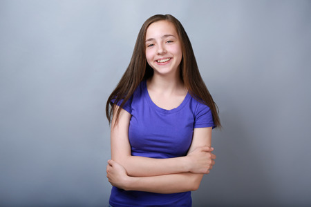 Portrait of a girl 10 years old on a blue background. Teenager girl 9 or 10 years old
