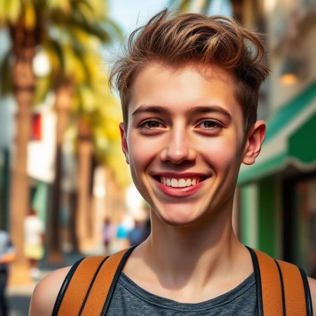 A teenage boy with short curly hair smiles brightly while walking through a bustling city street. The sun sets behind modern buildings, creating a vibrant atmosphere.