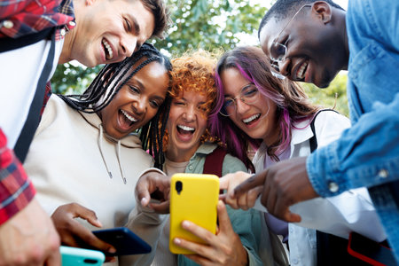 Mixed group of young people, representing various races, enjoy themselves while using their smartphones during a meeting. Adult friends share photos