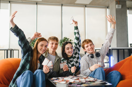 Four cheerful friends are sitting on an orange couch, playing a board game and raising their arms in excitement