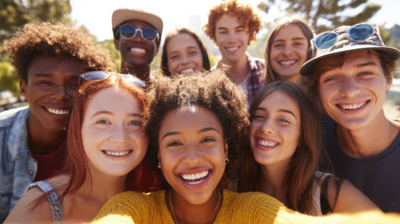 Global smiles: capturing joy in group selfies of cheerful and happy young people diverse nationalities, celebrating unity, friendship, cultural harmony in shared moments of happiness and togetherness