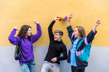 Multi-ethnic and gender friends gesturing success while taking a selfie next to a yellow wall in the city