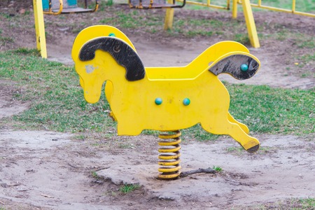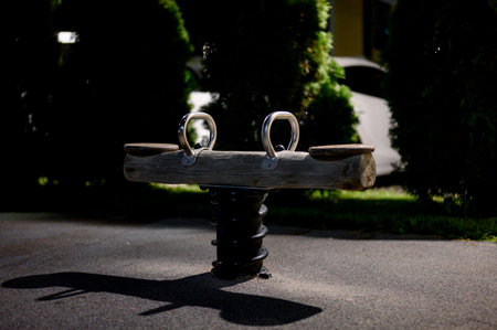 Children's seesaw on a spring made from a wooden log on the playground. Wooden rocking chair for two children with metal handles.