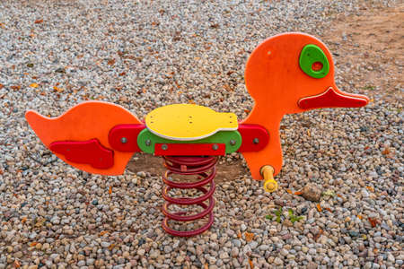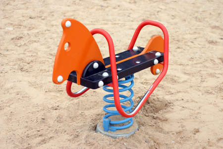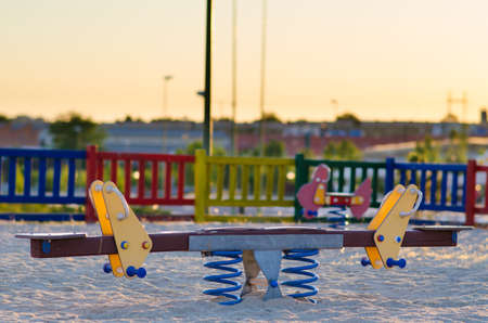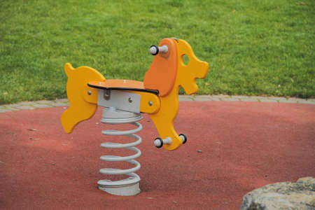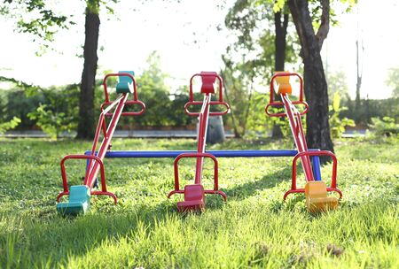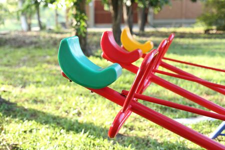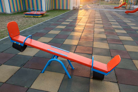 New modern plastic bright colorful empty toy seesaw swing on nursery playground on bright sunny summer day. Perfect place for children's activities outdoors.