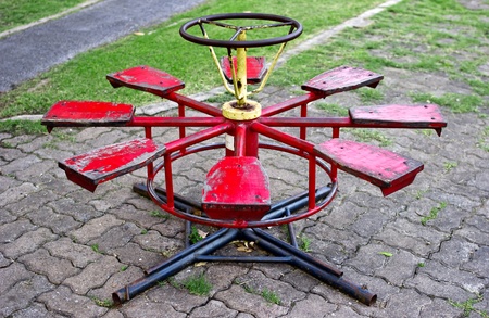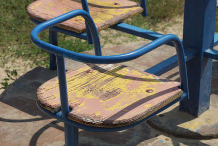 one empty colored wooden seat on a child blue metal carousel wheel in the playground in the park